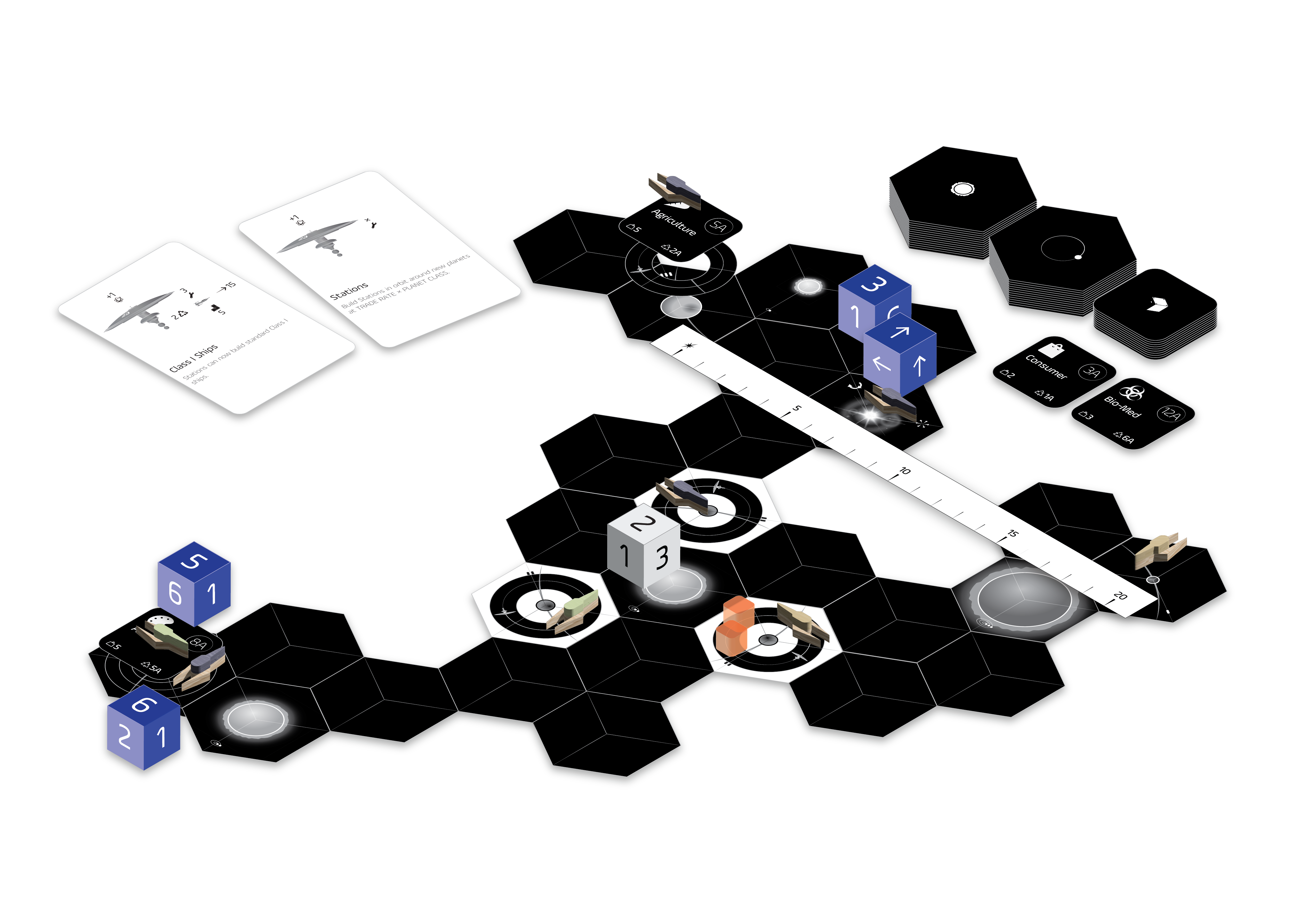 Star Carriers is a generative mid-weight strategy board game in which players venture to become the best interstellar carrier in the galaxy. Through exploration, innovation, and enterprise, players expand their routes between star systems to foster travel and trade. The game offers scientific, social, and economic challenges we might face as a commercial space-faring civilization.