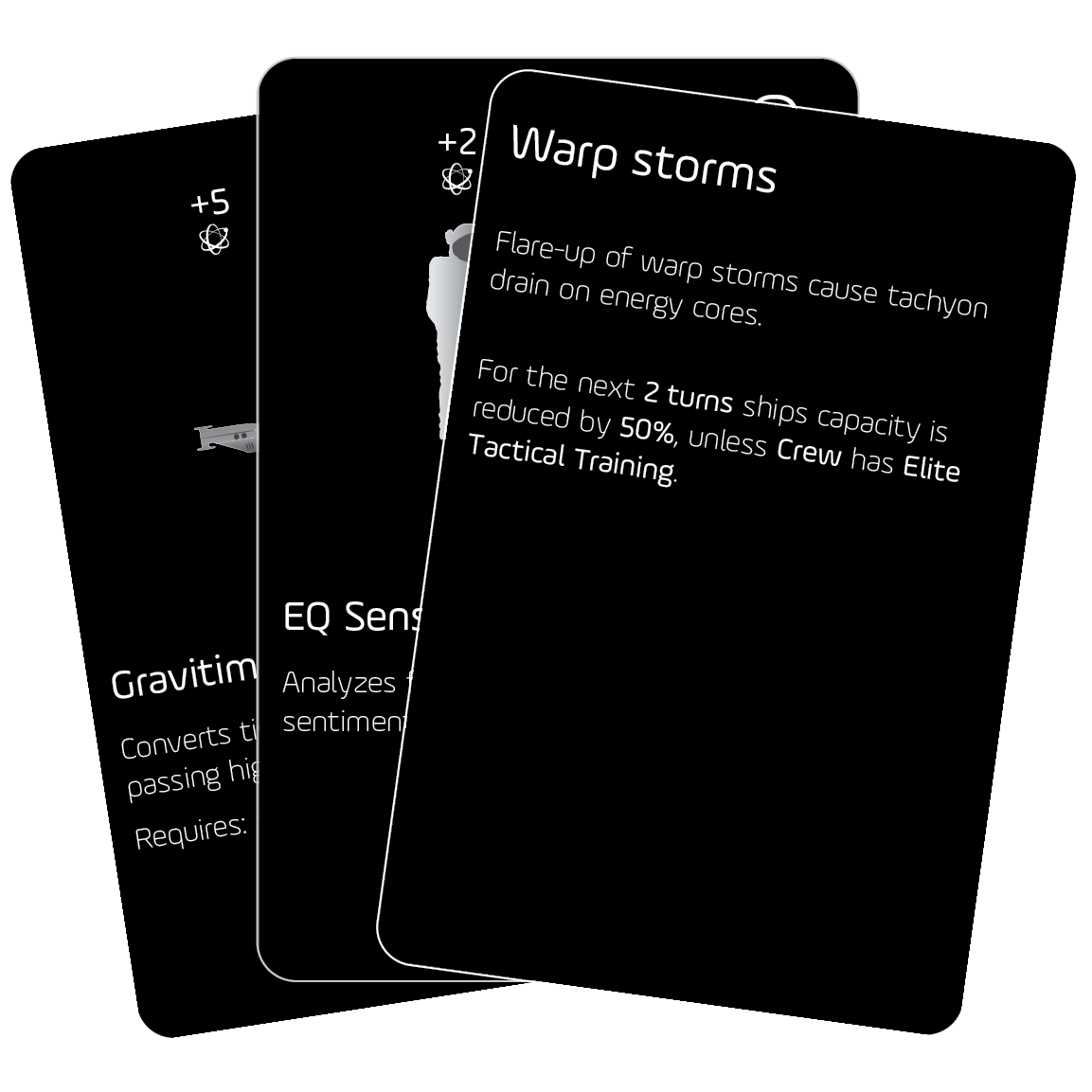 Successful enterprises consistently invest in and apply innovation, continuously using technology to push ahead of rivals, particularly during times of economic, social, and environmental disruption. Innovations and disruptions adds 16 ship, crew, and station technologies that improve transport capacity and distance, trade initiative, and station operations, as well as 12 disruptive events that test the quality of your leadership.